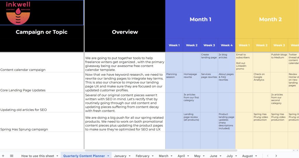 On the first tab, we’re going to map out a three-month gameplan, scheduling content creation, promotion, and support tasks for the quarter.