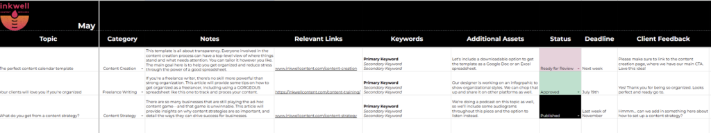 By the way, if something in my content calendar doesn’t work for you, go ahead and change it. Maybe different categories work better for you. Match the status options to your workflow. Change the drop down lists and headings to what works best for you. It’s your calendar, after all!